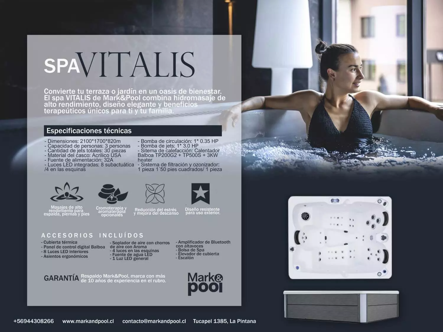 El Spa VITALIS combina confort y tecnología para ofrecer sesiones de hidroterapia potentes y seguras. Su diseño compacto y ergonómico (2 tumbonas + 1 asiento) maximiza el relax, la recuperación y el bienestar diario.